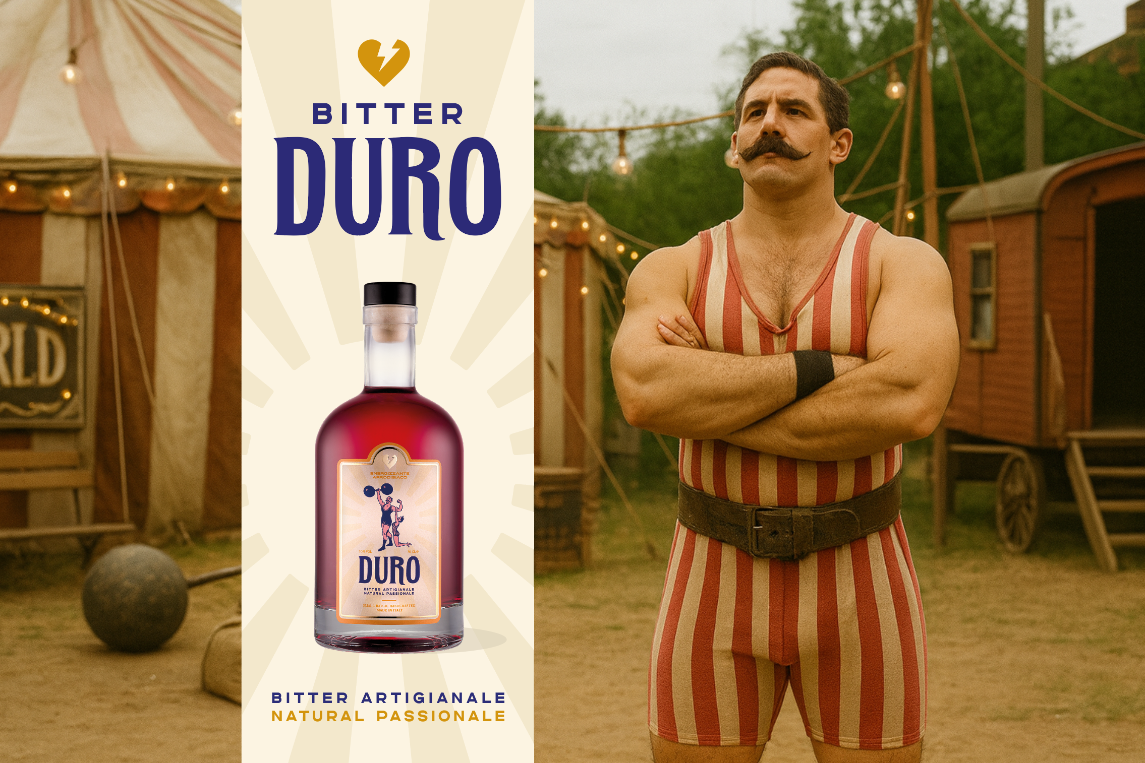 L'etichetta di "Duro" è un omaggio alla virilità, richiamando l'immagine del forzuto con un design che mescola vintage e leggerezza. Le illustrazioni evocano la forza e la vitalità, creando un legame diretto con l'energia del prodotto. I colori caldi e decisi sono scelti per trasmettere un senso di passione, mentre il font robusto riflette la caratteristica di un bitter artigianale immerso in un ambiente retrò. Ogni elemento visivo è pensato per raccontare non solo il gusto, ma anche l'atmosfera di convivialità e divertimento che accompagna ogni sorso."Duro" invita a riscoprire il fascino di un tempo in cui la forza e la passione si intrecciavano, rendendo ogni brindisi un momento da vivere intensamente.