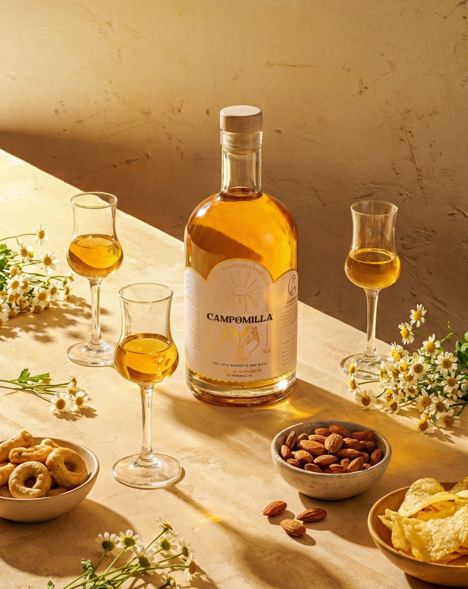 CAMPOMILLA nasce come una lode alla camomilla, fiore simbolo di equilibrio, delicatezza e benessere naturale. Un ingrediente antico della tradizione erboristica italiana, reinterpretato in chiave raffinata per dare vita a un liquore che parla di cura, armonia e piacere consapevole.